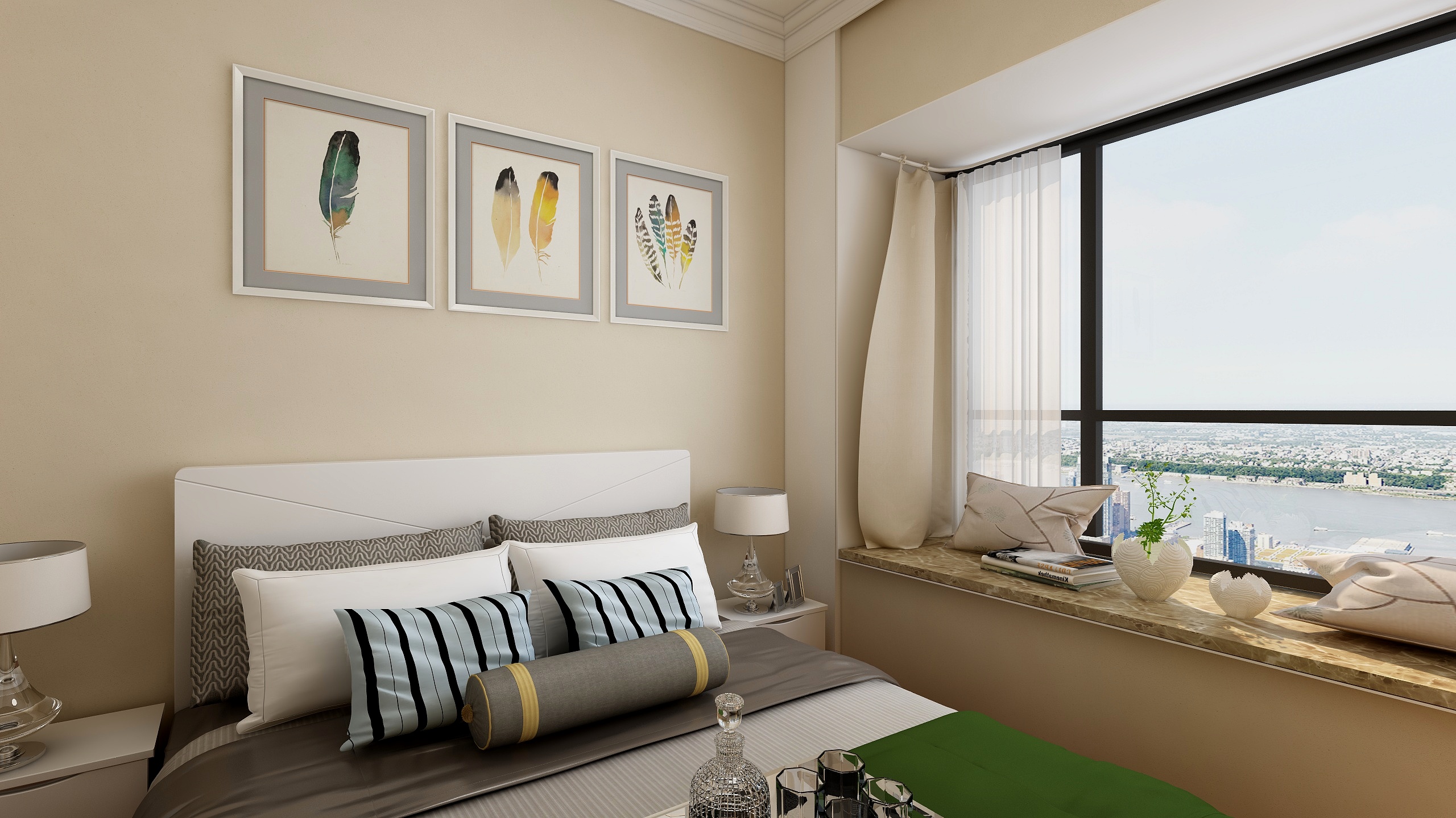 窗戶的設計增加了采光,周末在家睡懶覺的時候,在早晨的陽關透過窗戶,絲絲落在床上、或照在臉龐、枕側,很有幸福感的畫面。或者可以選擇伸個懶腰,在清晨的陽光中散步、晨跑、吃早餐;或者翻個身繼續睡回籠覺,好不愜意。灰色的床單和靠枕和整體色彩協調,使人更加舒適、安心。